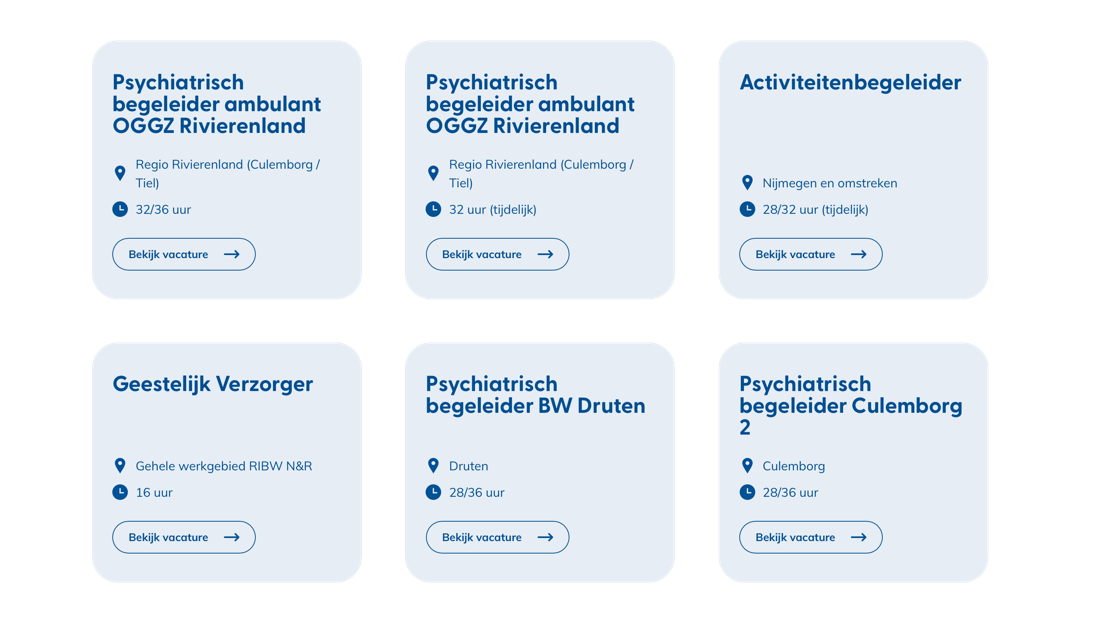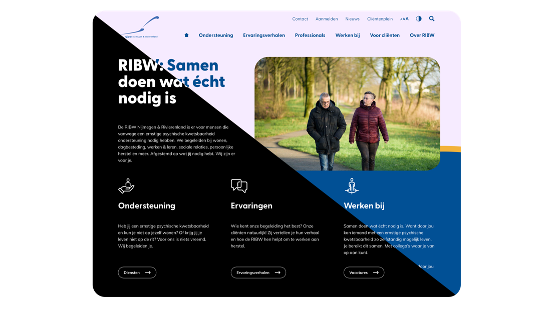 De Regionale Instelling voor Beschermd Wonen (RIBW) is een landelijk semi-overheidsorgaan waarbij elke regio separaat van elkaar opereert. Samen met RIBW Nijmegen & Rivierenland hebben we een omvangrijk, informatief platform opgezet met alle informatie omtrent beschermd en begeleid wonen, dagbestedingen, interne vacatures, ervaringsverhalen en nog veel meer. Dat alles in het uniek jasje, volledig in lijn met hun bestaande huisstijl en heerlijk visueel met mooie fotografie en iconen.
