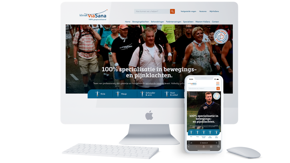 Orthopedische Kliniek ViaSana in Mill doet het anders dan concurrerende klinieken en ziekenhuizen. Door zijn relatief kleine omvang maar toch gevuld met specialisten zijn ze expert als het gaat om bewegingsklachten, behandeling ervan maar ook in het in kaart brengen van pijnscores en resultaat verwachtingsmanagement. De online tools die ze hiervoor inzetten hebben wij samen met de specialisten van ViaSana mogen bedenken, indelen, ontwerpen en realiseren. Alles erop gericht om de bezoeker een zo specifiek mogelijk beeld te geven in zijn unieke situatie, en dat tijdens één website bezoek.